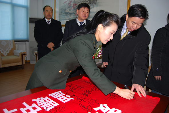 中国扶贫形象大使、著名歌唱家谭晶在爱心条幅上签字