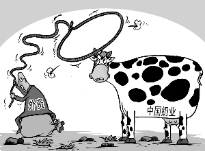 今年1至4月,我国奶粉进口达到15万吨,超过去年全年进口量的50%,价格同比上涨逾20%。而惠氏、雀巢、雅培等多家洋奶粉近期又传出预备涨价的消息。此种局面,不能不让人深深担忧,我国乳业可能被外资控制。 漫画刘道伟