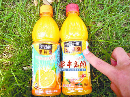 10月17日上午10点左右,在东韩社区附近,记者见到了刘女士,她向记者讲述了自己的遭遇——10月15日上午10点左右,我去朋友家玩。在东韩社区一家小超市花3块钱买了一瓶美汁源果粒橙。我准备打开喝的时候,感觉瓶盖很难打开。我记得以前买的果粒橙很好开的,我就仔细看了看。原来我买的那瓶饮料不是美汁源果粒橙,而是果汁源热带橙。那瓶饮料的包装和正牌厂家的包装几乎一模一样,无论是瓶子的形状还是外包装几乎都是一样的。