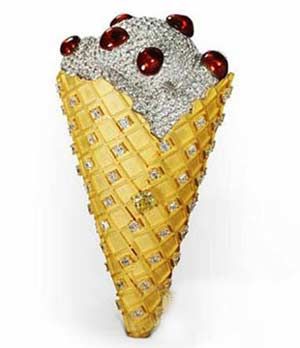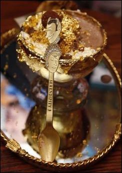 美国纽约市一家餐厅推出一款2.5万美元的巧克力圣代冰激凌,打破最贵甜点吉尼斯世界纪录。这款冰激凌的高脚杯以可食黄金为内膜,底部镶有1克拉白钻的18K黄金饰环。此外,用户吃完可以把饰有钻石的专用金勺带回家。