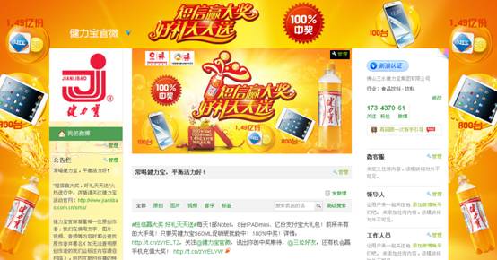 此外,微博平台也将对本次促销活动的信息进行即时更新,让每一位参与健力宝“短信赢大奖,好礼天天送”的健力宝粉丝都能够及时了解活动详情与中奖信息。以保证每一位赢得奖项的幸运儿都能够在最快时间内拿到奖品。