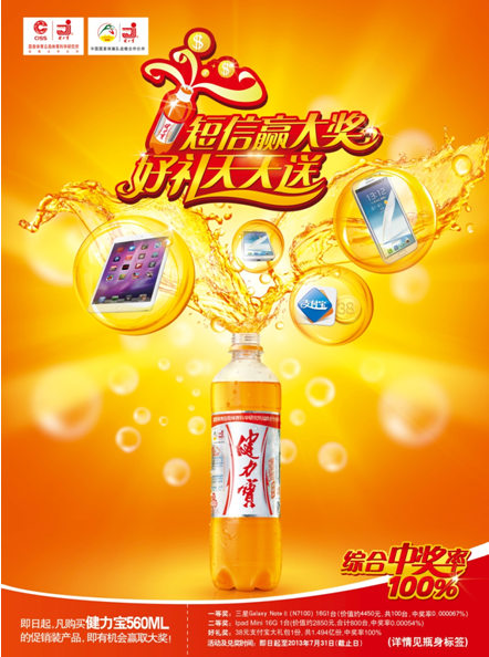健力宝此次促销活动,堪称是有史以来最大手笔促销活动。活动期间,每天派送 1 部三星 Galaxy note2 , 8 台 ipad mini ,并且还准备了 1.494 亿份 38 元支付宝大礼包,其奖品之丰富,中奖概率之高,让每一位拿到 560ml 促销瓶装健力宝饮料的朋友都有机会获得惊喜。