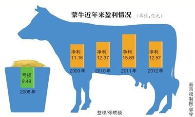 2008年,受三聚氰胺事件等因素影响,蒙牛亏损9.49亿元。自2009年摆脱三聚氰胺阴霾以来,蒙牛一直保持净利高速增长。2010年,净利12.37亿元,同比增长10.9%;2011年,净利15.89亿元,同比增长28.45%。但2012年蒙牛业绩再次出现下滑。