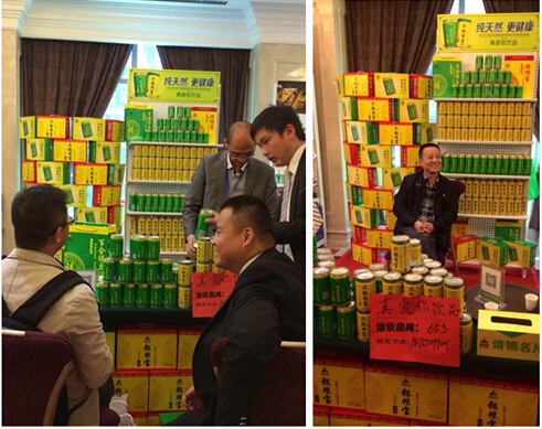 (图为真爱你食品会议大厅入口处试饮台,工作人员早早做好接待准备)