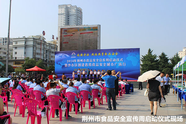 荆州市食品安全宣传周启动仪式暨沙市区创建省级食品安全城市广场行活动在这里隆重举行。荆州市市委、市政府、市人大、市政协相关领导、荆州市食安委成员单位、行业协会、食品企业代表、群众代表等400余人参加了活动。