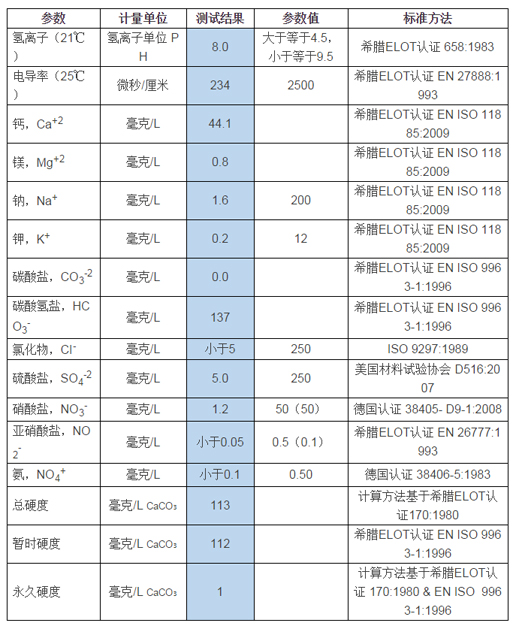 水质是衡量一款饮用水的重要标准,我们都知道长期饮用高钠含量的水会导致高血压、动脉硬化等血管疾病,欧怡天然泉水的钠成分不仅符合了低钠水成分含量的规格要求,而且还是整个市场钠成分最低的泉水之一;其硝酸盐(1.2毫克/升—50毫克/升)和亚硝酸盐(<0.05毫克/升—最高0.1毫克/升)的含量也符合欧盟的规定;PH值为8.0,有助于身体呈弱碱性,维持身体活力;113毫克/升的硬度也使得欧怡是最接近健康理想值的饮用水。