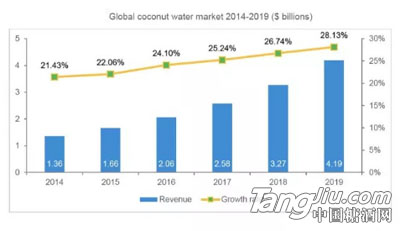 在行业增长放缓的大环境下椰子水逆势增长,而主打天然健康的唯他可可椰子水,成为饮料市场崛起的新品。Zenith Global 的报告显示,2016年全球替代饮料的销量猛增21%,并且有望在2020年时整体市场扩大1倍。椰子水饮料占据整体植物水的体量达96%,而唯他可可椰子水等品牌基本主导了全球替代饮料的市场。