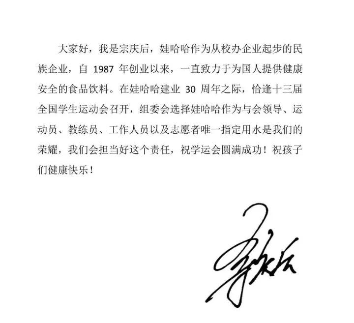 据赛事组委会项目合作部的沈叶庆介绍,去年下半年,当时的筹委会在寻求与娃哈哈合作的机会时,得到了宗庆后的接见,后者没用几分钟就一口答应,赞助整个赛会的全部用水。而在之后的工作落实中,娃哈哈方面甚至并不在意在赛场中企业LOGO露出数量等细节,只表态说,水不够用的话随时通知,他们马上追加。宗庆后在给赛事的寄语中特意提到,娃哈哈这个民营企业是从校办厂起家的,他对这一点始终惦念在心。