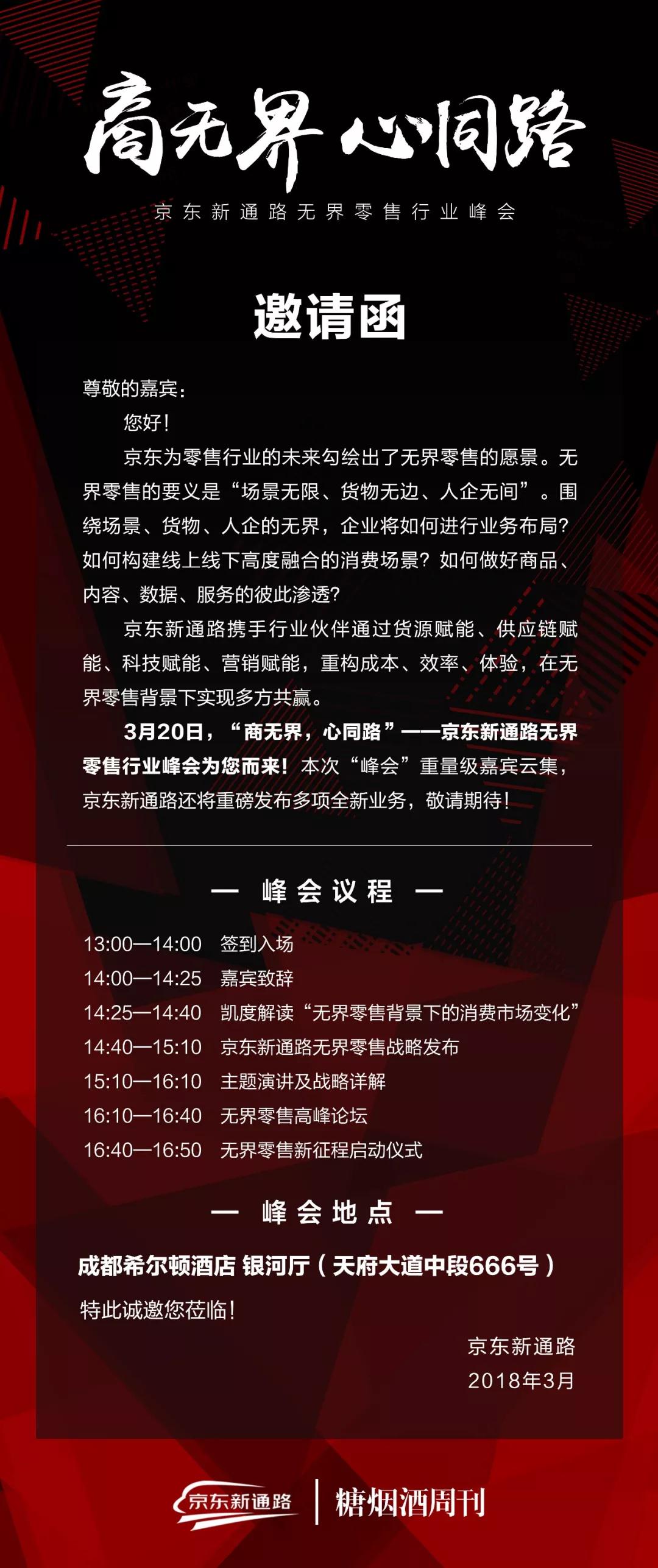 3月20日,京东新通路将携手《糖烟酒周刊》,在成都希尔顿酒店银河厅共同举办“商无界,心同路”——京东新通路无界零售行业峰会,同时广邀食品、酒水、饮料等行业厂商、经销商、批发商到场参会。