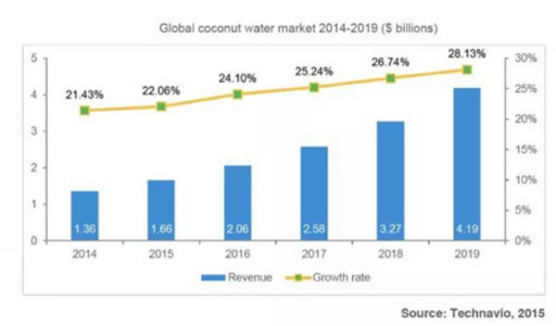 反观健康饮品市场本身,天然椰子水品类自从进入市场以来表现得都十分出色,含有椰子成分全品类产品的市场份额,在2017年的增长率高达250%,该领域专家认为,椰子水市场在2021年,市场份额将增加到70亿美元。有专家在2014年发布了一份至2019年的椰子水市场发展预测,而椰子水现今的市场规模,已经远超预测数字。值得一提的是,在2016年饮品市场疲软的情况下,椰子水依然能够保持大幅增速,这与其健康的属性有着莫大关系。