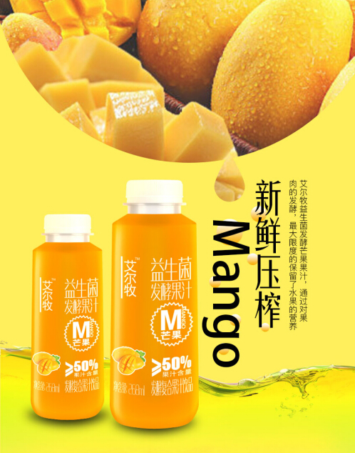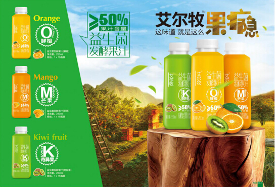打破单一口味,满足消费者多样化需求,艾尔牧发酵果汁系列产品精选优质果园新鲜采摘的水果,采用国际化尖端工艺精制而成,现有“鲜橙、芒果、奇异果”三种口味,口感香醇,清新浓郁,咀嚼感十足,已成功晋升为市场新宠!