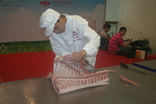 加拿大猪肉国际组织——中国国际肉类分割技能表演在CIMIE2010现场进行。