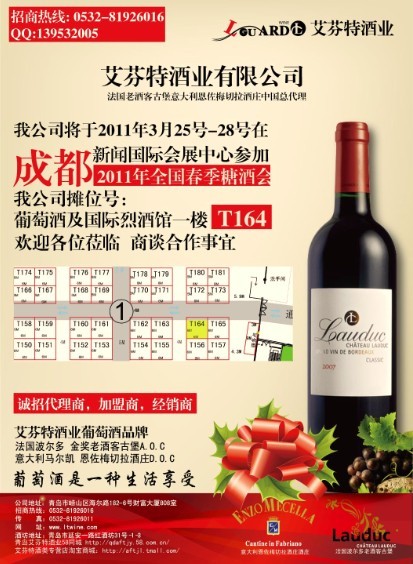 艾芬特酒业于2011年3月25日至3月28日参加成都2011全国春季糖酒会, 欢迎各位莅临参观,洽谈合作事宜。 我