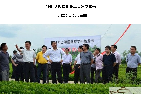 徐明华强调:2011年上海国际茶文化旅游节将在常德闭幕,桃源要借助旅游节这个平台,大力推介大叶茶,要让大叶茶走出湖南,走向世界。要以更加优惠的政策,更加优质的服务,更加优美的环境,吸引广大客商、各界朋友前来投资兴业。