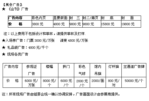2.国际展商:标准展位:2835美元∕9㎡ 光地:273美元∕㎡ 双面开口