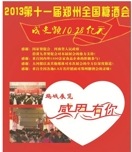 同时,还要感谢来自全国各地的6.8万名经销商、1300多家国内外参展企业,正是大家对瑞城郑州糖酒会的信赖和积极参与,才使得本届糖酒会取得了良好的社会效益和经济效益。
