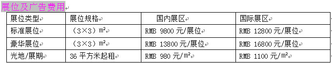 ※注:标准展位:三面围板(2.5m高)、地毯、楣板、射灯二支、洽谈桌一张、椅子二把220V插座一个。