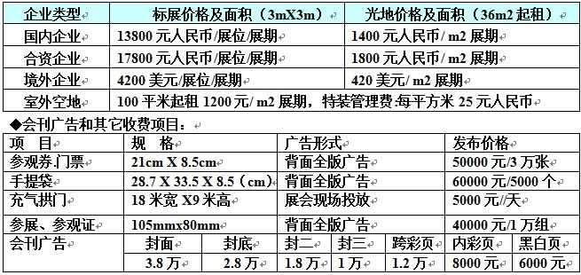 标准展位费用包括:展出场地、2.5高壁板、楣牌制作、9平方米地毯、洽谈桌一张、二把椅子、5A/220 V单相电源插座一个、日光灯二支。参展企业若选择双开口展位加收10%的费用,三开口展位加收15%的费用,光地费用包括:展出场地、保安、清洁服务(不包括特装管理费)。特装管理费:每平方米28元人民币。