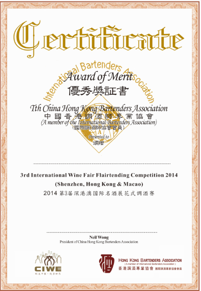 2014_第3屆深港澳國際名酒展花式調酒賽Certificate
