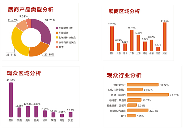 其它:展示柜、储藏与冷藏柜、面包货架,仿真模型,店面装饰,管理软件,家用烘焙原辅材料、设备、烤箱、模具、包装等,培训机构,烘焙书刊。