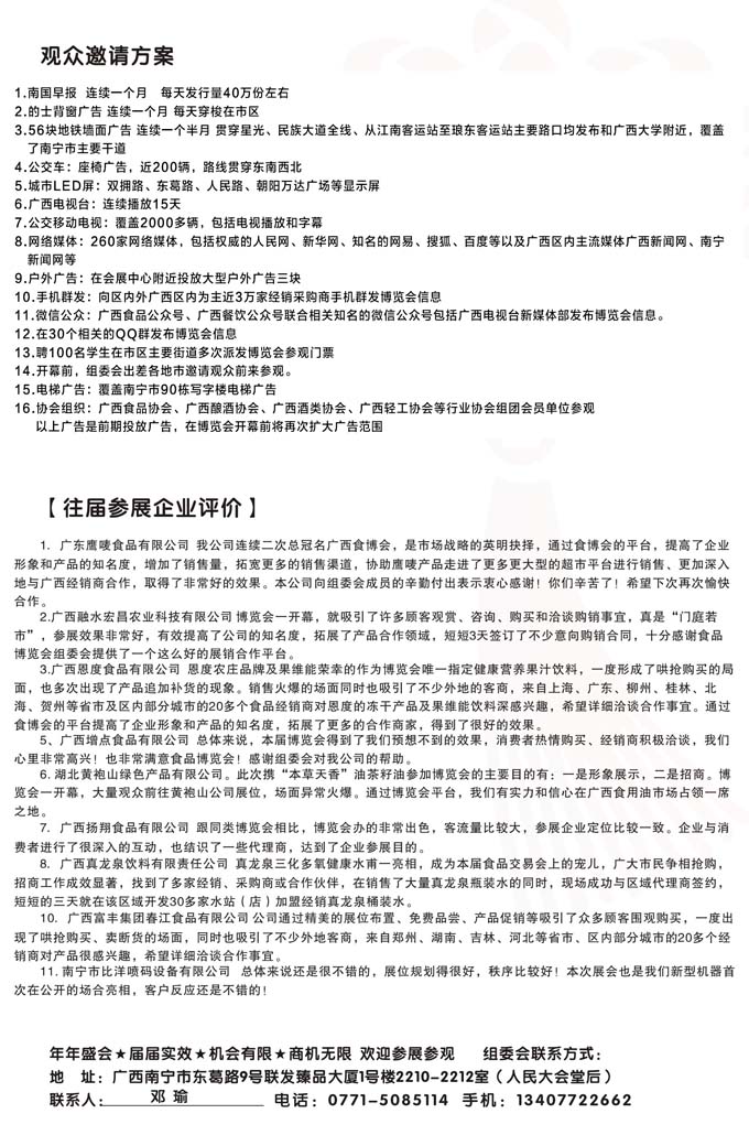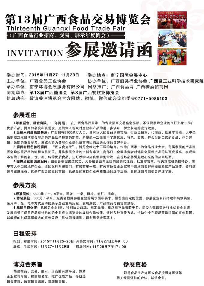 首页展会资讯展会新闻 展会新闻 第13届广西食品交易博览会-食品参展邀请函 未知 2015-09-17 10:18 展会新闻 上一篇第13届广西糖酒会-酒类参展邀请函 上一篇2016全国年货购物节暨第十届山东(临沂)年货精品展销会邀请函在成功举办九届年货会的基础上,2016第十届中国(临沂)年货精品展销会围绕赶年集、办年货、过大年集中展 相关文章 4月22日,2023年(第86届)山东省糖酒商品交易会将在淄博隆重开幕! 2021上海国际食品和饮料博览会,春耕·冬食与您年末共聚美食博览 2018第五届中国·商丘食品博览会即将盛大开幕 第五届北京世界食品博览会圆满落幕 —— 打造中国北方地区食品行 AnufoodChina聚焦进口食品圈诚邀买家 2018莫斯科国际食品展览会开幕 2018中部酒类食品行业——新营销 新趋势 新机遇 吉林省商务厅将2018北京世界食品博览会列入补贴展会 2018第十一届绿色食品博览会将在南昌举办 2018北京世界食品博览会诚邀业内人士莅临