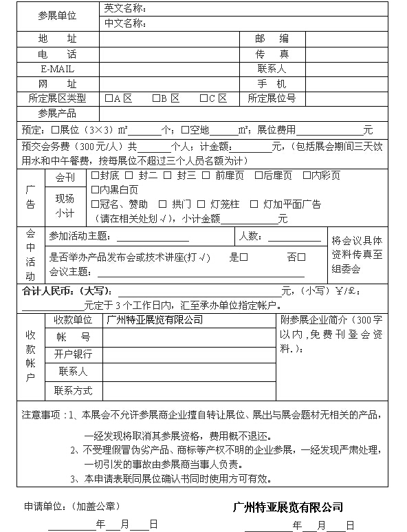 2)申请表得到组委会回复后三个工作日内请将参展费全部款项汇入组委会,逾期展位将不予保留。