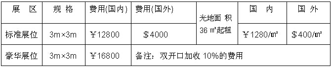 注:标准展位包括地毯、三面围板、公司名称楣板、咨询桌一张、折椅两把、射灯两盏、电源插座一个(特殊用电请事先说明,另行收费)。