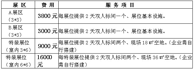 注:国际标准展位(9㎡)含三面围板、一桌两椅、射灯两盏、楣板文字、220v电源插座一个。