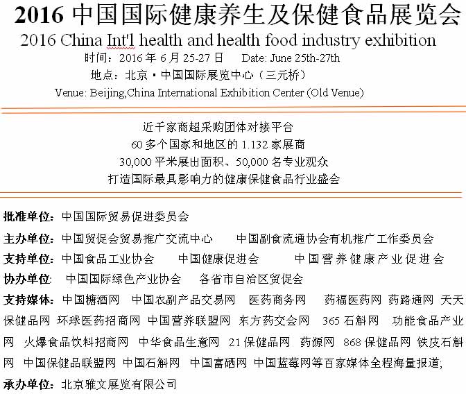 随着国民经济的增长、生活水平的不断提高,广大消费者对日常饮食思想观念也有了较大转变,具有营养健康、养生、保健之功效的食品备受倾睐,继而健康、保健食品市场也拥有了巨大的发展空间,《食品工业“十二五”发展规划》提出,到2016年,健康养生与保健食品产值将达到1万亿元,年均增长20%;用于补充人体维生素、矿物质的营养素补充剂、预防三高的食品被列入发展方向与重点。健康的保健食品及营养食品正逐渐成为我国居民均衡膳食,预防疾病和改善健康的首选佳品,经中国贸易促进委员会批准,由中国国际贸易促进委员会贸易推广交流中心、中国副食流通协会有机推广工作委员会等共同主办“2016中国国际健康养生及保健食品展览会”,将于2016年6月25-27日在中国国际展览中心召开,本届康博会也得到了国内外众多知名商家、行业协会、新闻媒体的大力支持,主办方推出重点采购商计划,重点采购商可享免费酒店住宿,免费参加论坛,免费享用展会现场洽谈区等参观洽谈服务,搭建产业推广交易平台,顺应行业发展趋势,提高企业对外形象宣传、推广品牌化市场销售,促进国际经贸交流,努力打造中国国际-专业健康保健食品行业盛会!