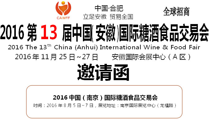 为推动中国糖酒食品行业快速发展,2016年11月25—27日将在安徽国际会展中心继续举办“CAWFF2016第13届中国(安徽)国际糖酒食品交易会”,本届展会组委会本着合作、互推、共赢的合作理念实现本届交易会不论规模和档次再突破历届之最,欢迎广大厂商前来参展、参观!