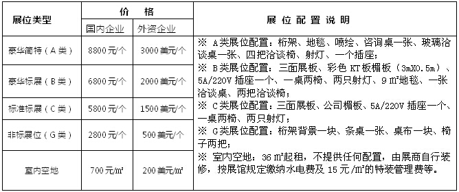 1、展位费用:(标准展位3米*3米=9平米,双开口展位另加收1000元人民币)