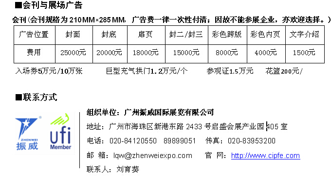展位配置:地毯、楣板、一桌两椅、日光灯管两只、垃圾篓一个。
