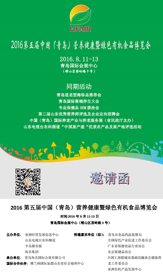 2016第五届中国(青岛)营养健康绿色有机食品博览会以“健康感动生命——Health for life”为主题、打造绿色健康为宗旨,得到了相关权威部门和业界的大力支持。青岛天然绿色及有机食品展会为生产商与经销商、贸易商及终端客户提供便捷的交流平台,是厂家打开国内外市场,展示推广新产品、交流新技术的品牌盛会!海名会展致力于有机食品展会10年,丰富的经验、专业的运作团队、庞大的数据资源等,能为您在华东地区品牌宣传、开拓市场、产品推广、商贸洽谈等各方面提供最强有力的帮助。