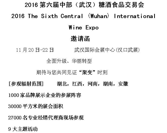 中部(武汉)糖酒食品交易会不断拓展、改革创新、蓬勃壮大。在此诚挚邀请各地糖酒食品行业的经销商、代理商、批发商、零售商和酒庄会所、酒店及餐饮机构、食品商超、加盟商及企事业单位等专业买家莅临展会,了解新产品、把握流行趋势、找准经营方向。我们精心组织筹备,360度贴心服务,定会让您不虚此行,满载而归。热切期待您的光临!