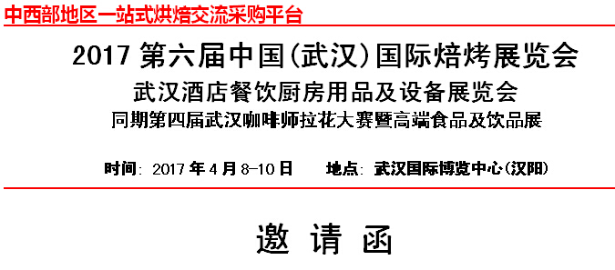 第六届武汉国际焙烤展览会将于2017年4月8-10日在武汉国际博览中心集聚国内外烘焙、餐饮、设备、原料、包装及行业新动态,分享新设备、新原料、新技术、新产品、新包装、新概念,给华中烘焙食品带来新商机直面终端市场,打造人心所向的一站式平台。