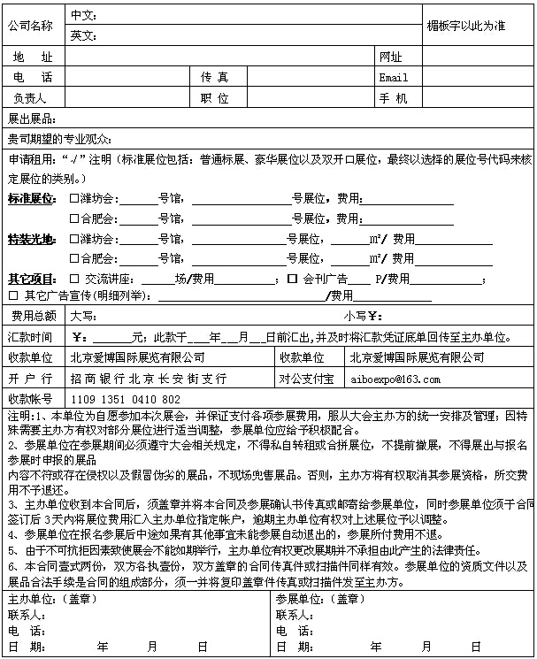 4.申请展位3个工作日内将参展费用电汇或交至组织单位,过期不付款者,组委会有权变更原定展位或取消其参展资格。