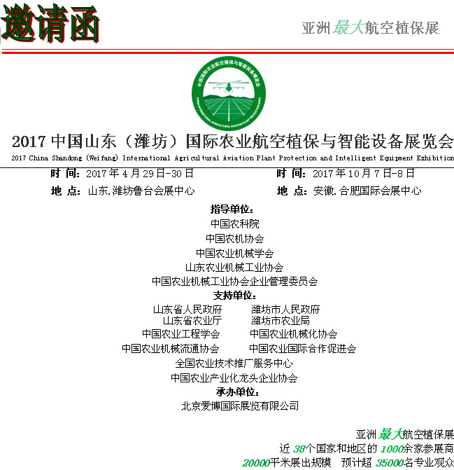 国家十三五规划明确提出加快发展都市现代农业,三产融合助力都市现代农业快速发展,提高农业技术装备和信息化水平,全面实现现代农业科技创新推广体系,加快推进农业机械化,加强农业与信息技术融合,发展智慧农业,提升农业技术装备水平。为响应国家政策规划,推动我国农业现代化快速发展,市场供应产品种类显著增加、产品向多元、优质、功能化方向发展,打造全球最大的农业高新科技展示交流与采购平台,由北京爱博国际展览有限公司联合发起的2017中国山东(潍坊)国际农业航空植保和智能设备展览会将于2017年4月29-30日在山东.潍坊鲁台国际会展中心盛大开幕,此次展会展出使用面积20000平米,预计参展商家1000家,采购商达35000人次,届时欢迎参观参展。