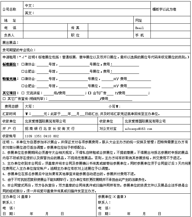 3.参展单位在选定展位后请认真填写《参展申请及合约表》,加盖公章后传真或电邮至大会组委会。