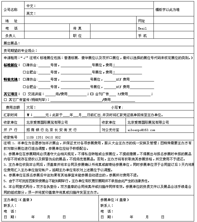 3.参展单位在选定展位后请认真填写《参展申请及合约表》,加盖公章后传真或电邮至大会组委会。