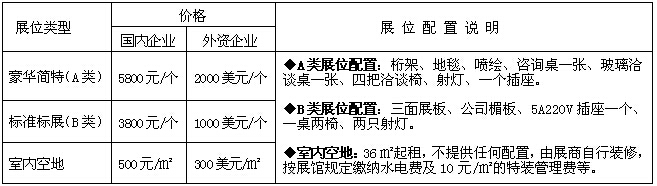 1、展位费用:标准展位3米*3米=9平米,双开口展位另加收500元人民币。