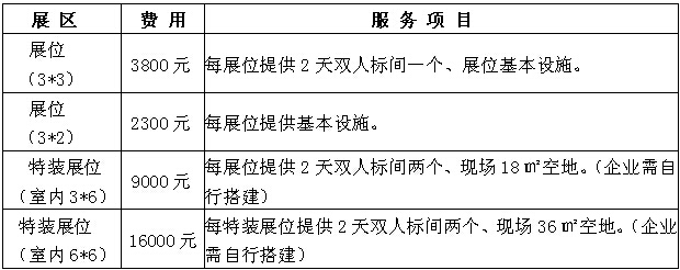 注:国际标准展位(9㎡)含三面围板、一桌两椅、射灯两盏、楣板文字、220v电源插座一个。