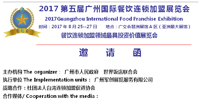 展望2017,第五届广州国际餐饮连锁加盟展览会再接再励,展会规模预计突破47600平方米,参展商家将达600家,与会创客人数将突破120000人次。与此同时:国际餐饮连锁品牌招商会+商业体高端对接会+门户网站推广,将结合线上线下资源,立体强势推广。