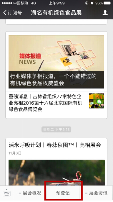 B、关注微信haiminguj(海名有机绿色食品展),点击菜单栏