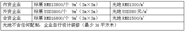 9㎡标准展位收费(包括:展出场地,2.5m高壁板、一条中英文楣板、洽谈桌一张、二把椅子、220V电源插座、射灯二支、展位内满铺地毯;注:双开口展位加20%费用;)