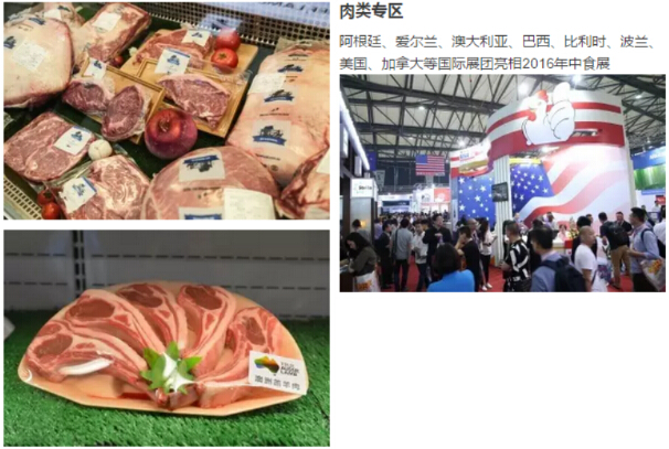 自2014年设立肉类专区以来,中外展商踊跃参加,展区面积稳步增长。2016年肉类专区内,阿根廷、爱尔兰、澳大利亚、巴西、比利时、波兰、丹麦、德国、法国、荷兰、加拿大、美国、乌拉圭、西班牙、英国等组织了专业展团亮相第十七届中食展;另外,阿兰那、HMA、PMI食品、广州沛泽、山东硕昌、牡丹江家和等海内外知名肉企也争相参与中食展。