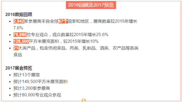 作为亚洲最大的食品及饮料展会,中食展期待在2017年,能够汇集国内外知名餐饮行业上下游企业,力求把餐饮供应链主题馆打造成为中国最专业、最高效的酒店餐饮食材供应链的贸易平台,并为全球商家提供高效服务,优质的特色现场活动更将提升展商和专业观众的参展感受。