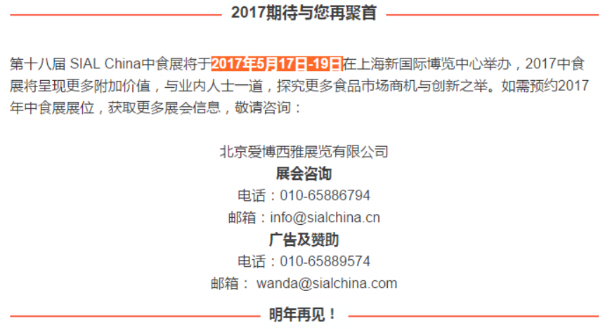 2016年,山东飞达集团、河南王守义十三香、上海味好美、上海良友集团、青岛长寿、东莞百味佳、重庆忠州腐乳、山东庞大、金宝汤、台湾金兰酱油、台湾全雅牛头牌、德国冠利、韩国希杰、日本龟甲万等知名企业或品牌亮相第十七届中食展;同时,中食展的优质特色活动也吸引了众多龙头企业的热情参与,李锦记、联合利华、雀巢、太太乐等行业巨擘纷纷亮相。