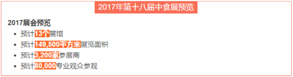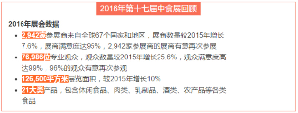 无论在规模还是展会质量上,中食展都已毫无疑问的发展成为亚洲最大创新食品展。2017年,中食展将再接再厉,携手广大新老展商、观众、媒体及合作伙伴,继续创造更多的辉煌、更大的成就。