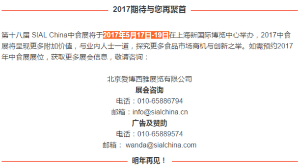 2017期待与您再聚首第十八届 SIAL China中食展将于2017年5月17日-19日在上海新国际博览中心举办,2017中食展将呈现更多附加价值,与业内人士一道,探究更多食品市场商机与创新之举。如需预约2017年中食展展位,获取更多展会信息,敬请咨询: