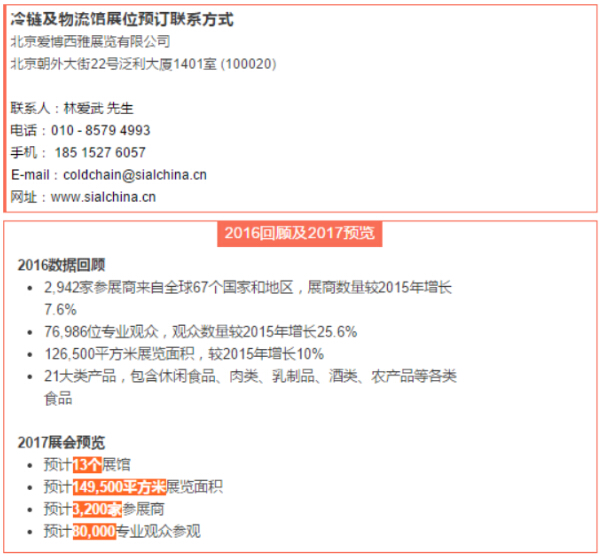 2016年中物联冷链委首次组织了“食品冷链物流专区”吸引了冷链物流百强和众多冷链技术装备企业参展,引起业内轰动。2017年中物联冷链委将扩大规模,进一步组织“冷链及物流馆”亮相第十八届中食展。